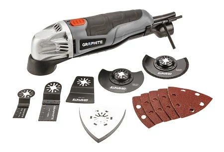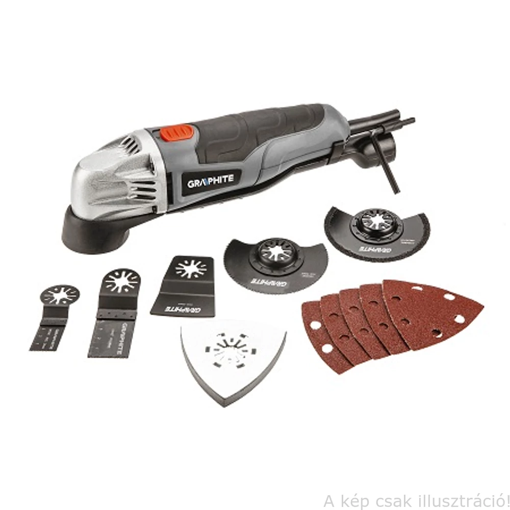 Felső kategóriás GRAPHITE többfunkciós szerszám (kat. sz. 59G020) 6 cserélhető betétszerszámmal vágáshoz, csiszoláshoz és kaparáshoz. A 180 W teljesítményű szerszám nagyon sokféle célra használható, az egyetlen korlát használójának képzelőereje. A gép feje percenként 20 000 kilengést végez, a kilengés szöge 2,8°. A kis méretű, kézreálló szerszám fel van szerelve adapteres feltéttel a porelszíváshoz. Közvetlenül csatlakoztatható a porszívó csöve. A gép áttételháza tartós alumínium-ötvözetből készült, a kényelmes forma és a kis tömeg lehetővé teszi a munkát egy kézzel. A munkát könnyíti meg a hosszú hálózati csatlakozókábel is. Ezen felül a készlethez tartozik: betétszerszámok, csiszolópapír, porelvezető feltét adapterrel, kapocs és hordtáska. A CE tanúsítvány bizonyítja az európai szabványoknak való megfelelést.