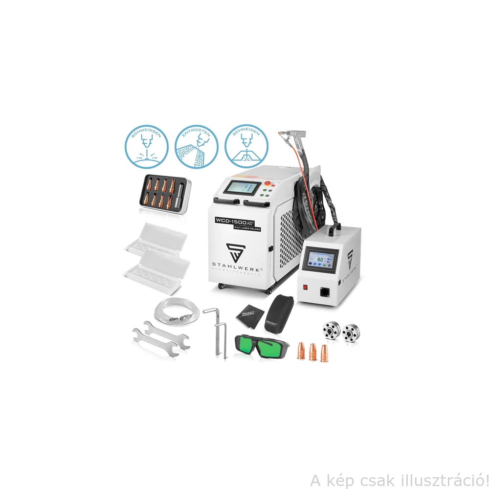 A STAHLWERK 3 az 1-ben WCD-1500 Laser Pro lézersugaras hegesztőberendezés 1500 watt teljesítményével ideális a precíz hegesztéshez, vágáshoz és rozsdamentesítéshez. A lézersugaras hegesztés precíz hegesztési varratokat biztosít alacsony termikus torzítással nagy hegesztési sebességnél a munkadarabba történő koncentrált energiabevitelnek köszönhetően. Így rövid időn belül tökéletes munkaeredmények érhetők el. A kézi lézer a legújabb generációs szálas lézertechnológiával rendelkezik, és a legnagyobb terhelésnek is ellenáll. Az integrált vízhűtés lehetővé teszi a maximális teljesítmény folyamatos lekérését. A sokoldalú kombinált hegesztőgép akár 4 mm-es (rozsdamentes acél 4 mm | vas 4 mm | alumínium 3 mm) mélységig vág, és 10 és 20 mm között változtatható tisztítási tartománnyal rendelkezik a rozsdamentesítéshez. A lézeres hegesztőpisztoly ergonomikus kialakítású, és kényelmes kezelést ígér még hosszabb munkaciklusok során is. Ezen kívül a lézerpisztoly integrált lézerfókuszral rendelkezik a pontos pozicionálás érdekében. A kívánt beállítások gyorsan kiválaszthatók az átlátszó kezelőpanelen. Az egység külön szinergikus hegesztőhuzalvezetővel rendelkezik 4 görgős meghajtással, munkamemóriával, intelligens hűtéssel és túlmelegedés elleni védelemmel. A praktikus kézi lézer 230 voltos hálózati csatlakozással működik. Könnyű és kompakt kialakításának köszönhetően a többfunkciós lézerhegesztő ideális mobil használatra az iparban, a kézművességben és a barkácsolásban.