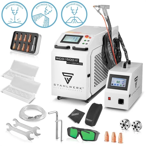 The STAHLWERK 3-in-1 laser welder WCD-1500 Laser Pro with a power of 1,500 watts is ideal for precise welding, cutting and derusting. Laser beam welding ensures precise weld seams with low thermal distortion at high welding speeds due to the concentrated energy input into the workpiece. In this way, perfect work results can be achieved in a short time. The hand-held laser features state-of-the-art fiber laser technology of the latest generation and can withstand the highest loads. Integrated water cooling enables continuous retrieval of maximum power. The versatile combination welder cuts to depths of up to 4 mm (stainless steel 4 mm | iron 4 mm | aluminum 3 mm) and has a variable cleaning range of 10 to 20 mm for derusting. The laser welding torch is ergonomically shaped and promises comfortable handling even during longer work cycles. In addition, the laser torch has an integrated laser focus for precise positioning. The desired settings can be quickly selected on the clear control panel. The unit features a separate synergic welding wire guide with 4-roller drive, job memory, smart cooling and overheating protection. The practical handheld laser is operated with a 230 volt mains connection. Thanks to its lightweight and compact design, the multifunctional laser welder is ideal for mobile use in industry, crafts and DIY.