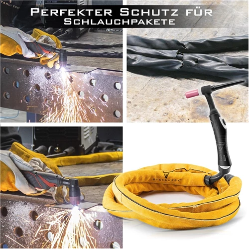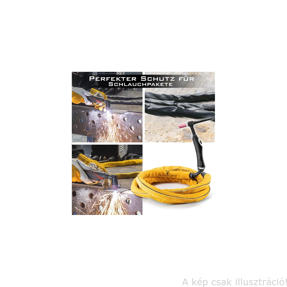 Az eredeti, égésgátló tehén hasított bőrből készült STAHLWERK védőtömlő megvédi a hegesztőberendezések és plazmavágók tömlőszerelvényeit a hőterheléstől és a szálló szikráktól. A rugalmas bőr védőhuzat 5 méteres hosszban kapható, hő- és tűzálló. A bőrvédő tömlő két fontos funkciót lát el: A flexibilis tömlő védelmet nyújt a külső hatások, például szennyeződés vagy szikra ellen, és a hagyományos gumiborításhoz képest nagymértékben növeli a rugalmasságot a hegesztési és vágási munkák során. A rugalmas védőtömlő professzionális kábelkezelést tesz lehetővé. A pisztolykábel egyszerűen behelyezhető a rugalmas hüvelybe, és gyorsan zárható tépőzárral. A tömlőcsomag hagyományos gumiborításának bőrvédőtömlőre való cseréje rugalmasabbá és ellenállóbbá teszi a tömlőcsomagot.