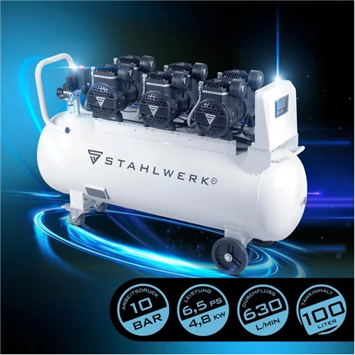 100 literes tartálytérfogatával és 10 bar maximális üzemi nyomásával az olajmentes légkompresszor ideális a pneumatikus szerszámok professzionális üzemeltetéséhez.