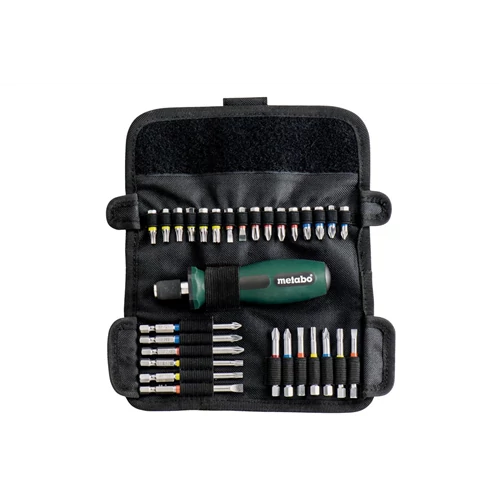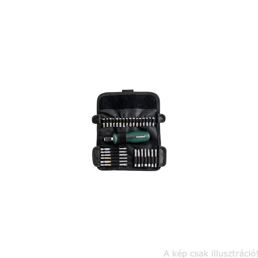 Króm-vanádium acél bitek (S2-minőség); bitek színkódolással: a megfelelő bit gyorsan és egyszerűen megtalálható; Kiváló minőségű, robusztus doboz speciális Metabo dizájnnal