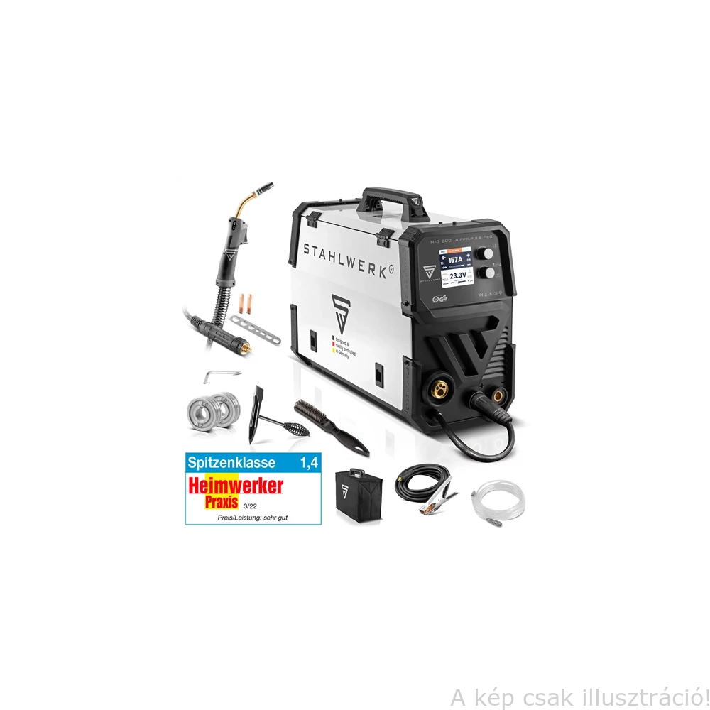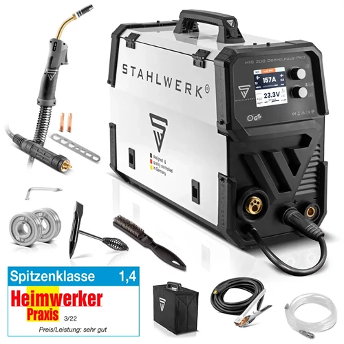 A nagy teljesítményű STAHLWERK MIG 200 Double Pulse Pro védőgázas hegesztőgép kényelmes impulzus- és dupla impulzus funkcióval rendelkezik, és akár 200 amperrel is működik.