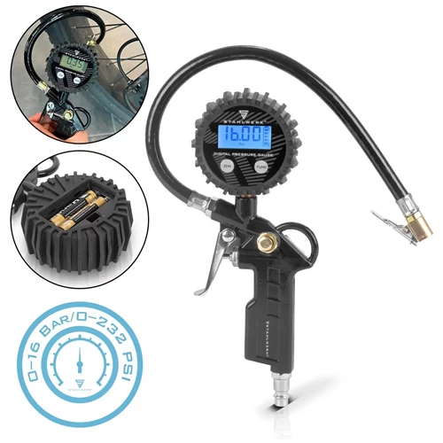A digitális STAHLWERK sűrített levegős gumiabroncs-felfújó pisztoly egy praktikus 3 az 1-ben eszköz.