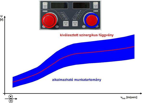 Fokozatmentesen állítható gépeknél mindig az alkalmazott huzalsebességhez igazítja az ívfeszültséget a szinergikus beállítás. Ha az ívhossz mégsem megfelelő, mód van annak finomítására. Ráadásul a hegesztés dinamikáját is az alkalmazáshoz igazítja a szinergikus beállítás, de ennek értéke is finomítható.