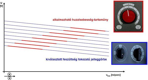 A fokozatkapcsolós gépeknél az ívfeszültséget a fokozatkapcsolóval kiválasztott jelleggörbe határozza meg. Ezeknél a gépeknél az ívfeszültséget nem tudja a szinergikus beállítás az alkalmazott huzalsebességhez igazítani, hanem fordítva, a kiválasztott jelleggörbe alapján, a huzalsebességet korlátozza le az abban a feszültség fokozatban való alkalmazhatóság tartományára.